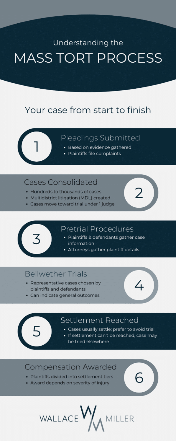 Class actions and mass torts serve the same function: they allow many cases against a defendant or group of defendants to be decided through consolidation. In a mass tort case, however, your litigation always remains individual. The cases are often brought together in a Multidistrict Litigation to go through the process of general discovery—obtaining the facts of the case that apply to all plaintiffs—and to determine liability. After that process is concluded, the attorneys in a mass tort case will assess the facts about the impact of the product on individual clients, as well as their individual circumstances, and the suits will continue in case-specific litigation.